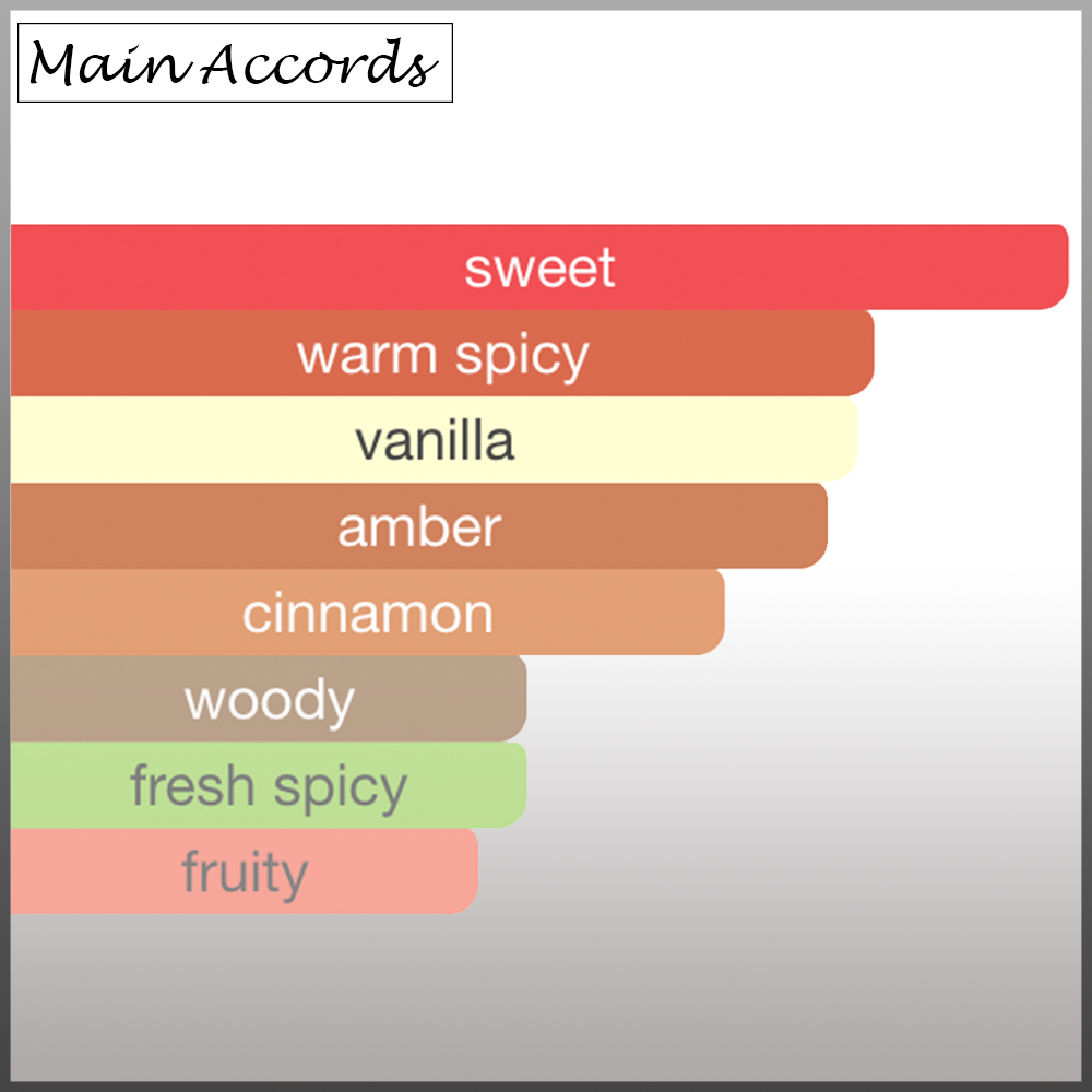 Cinnamon, Nutmeg, Bergamot, Dates, Praline, Tuberose, Mahonial, Vanilla, Tonka Bean, Amberwood, Myrrh, Benzoin and Akigalawood