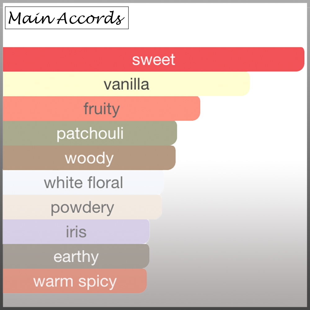 Black Currant, Pear, Iris, Jasmine, Orange Blossom, Praline, Vanilla, Patchouli and Tonka Bean