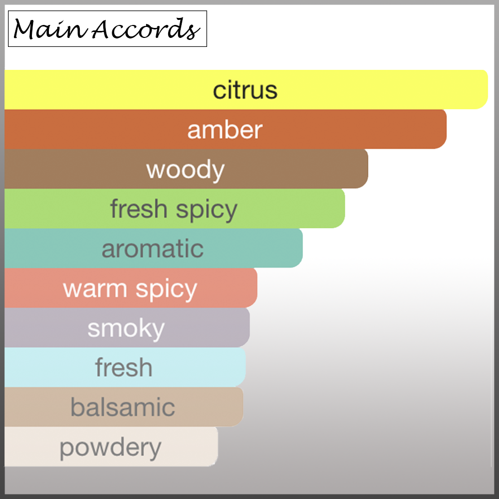 Grapefruit, Lemon, Mint, Bergamot, Pink Pepper, Aldehydes, Coriander, Ginger, Nutmeg, Jasmine, Melon, Incense, Amber, Cedar, Sandalwood, Patchouli, Amberwood and Labdanum