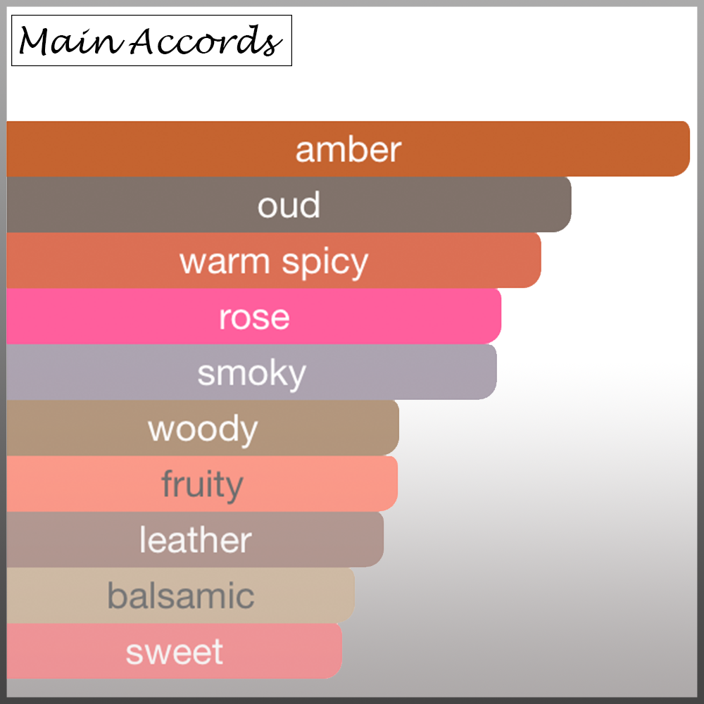 Agarwood (Oud), Incense, Rose, Raspberry, Amberwood, Saffron, Benzoin, Birch, leather and Geranium
