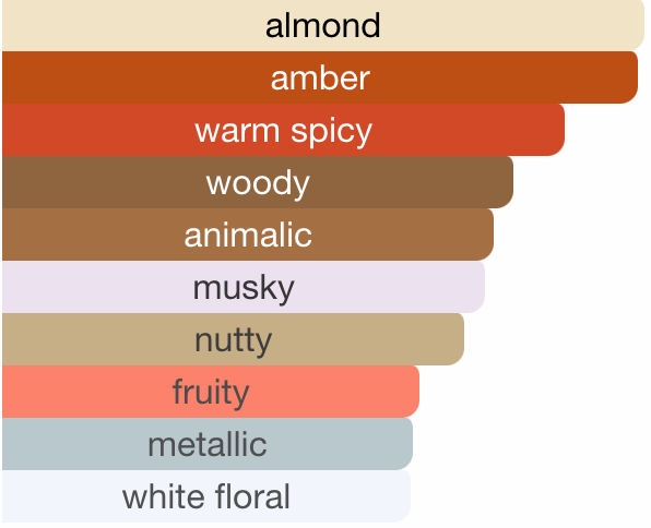 Bitter Almond, Saffron, Egyptian Jasmine, Virginia Cedar, Ambergris, Woody Notes, Musk, Ambroxan and Cashmeran