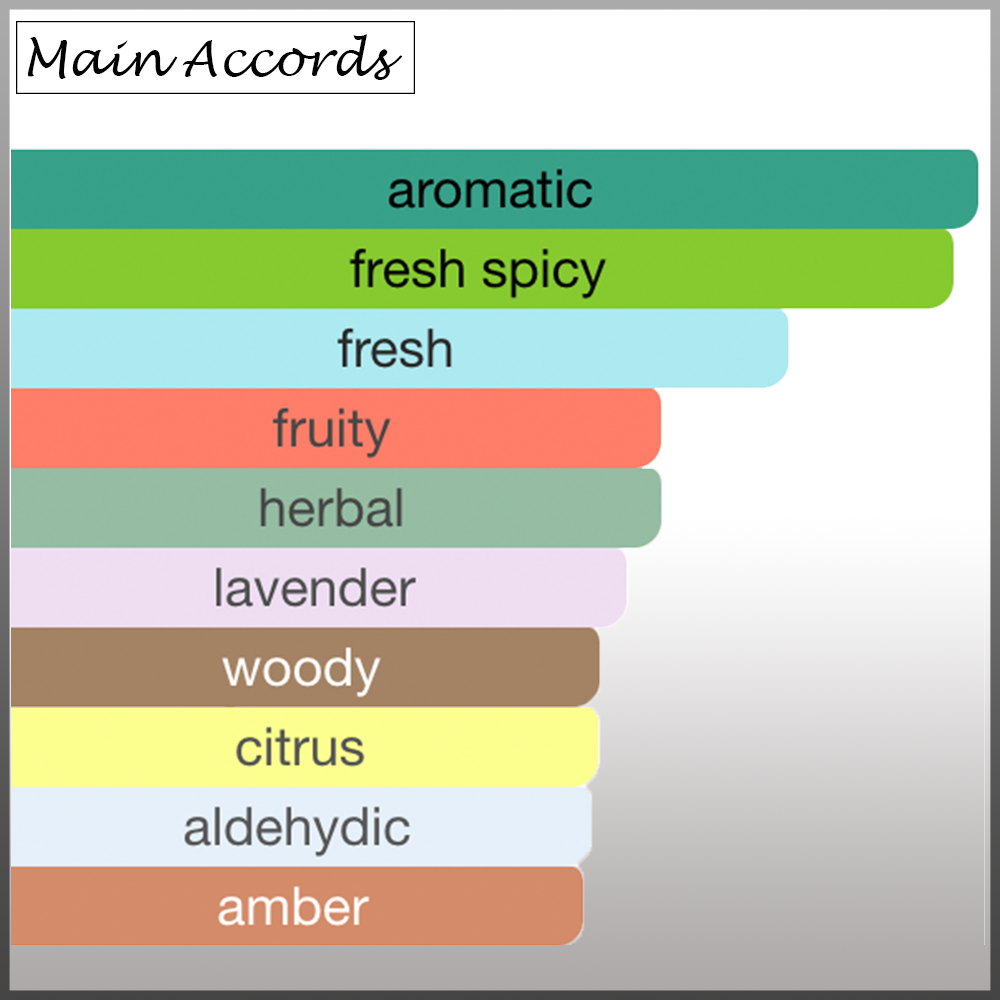 Aldehydes, Bergamot, Ginger, Mint, Lemon, Apple, Violet Leaf, Pineapple, Sage, Geranium, Ambergris, Musk, Cedar, Balsam Fir, Vetiver and Incense