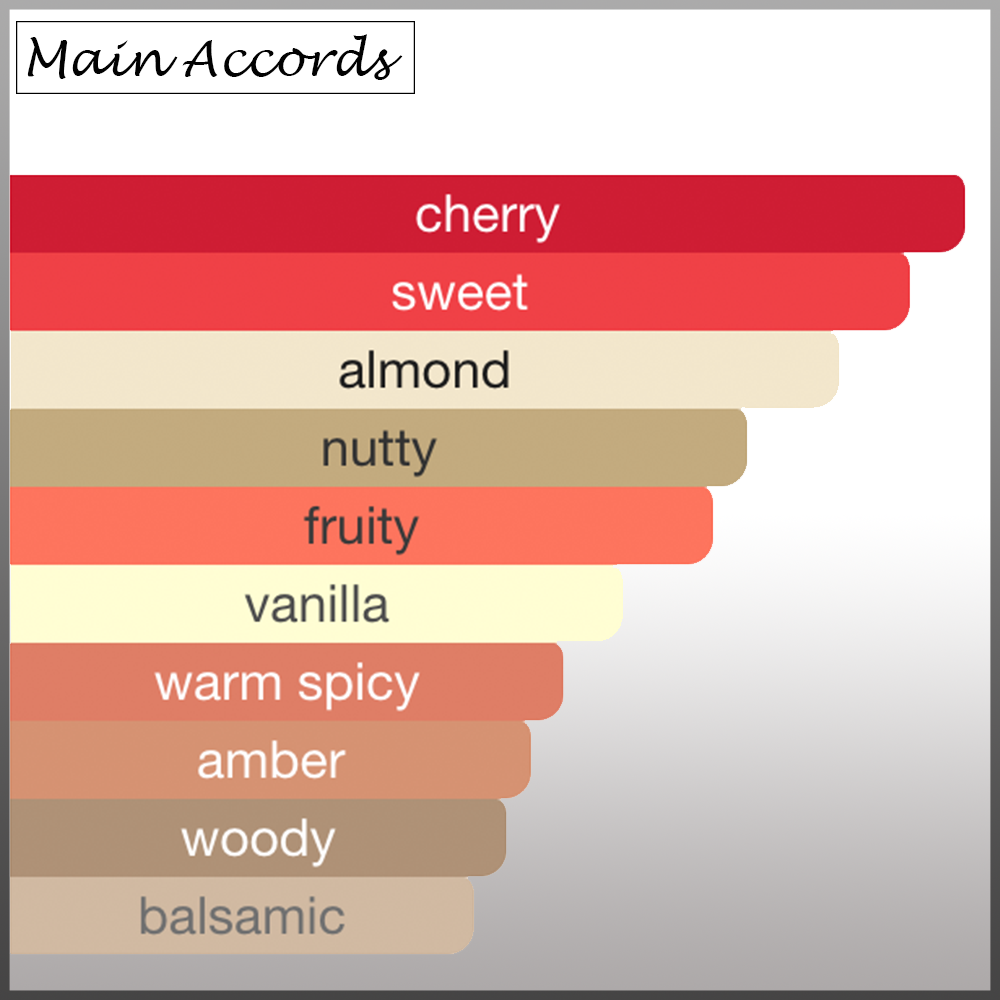 Bitter Almond, Black Cherry, Cherry Liqueur, Sour Cherry, Plum, Turkish Rose, Jasmine Sambac, Vanilla, Tonka Bean, Cinnamon, Peru Balsam, Sandalwood, Benzoin, Cloves, Cedar, Patchouli and Vetiver.