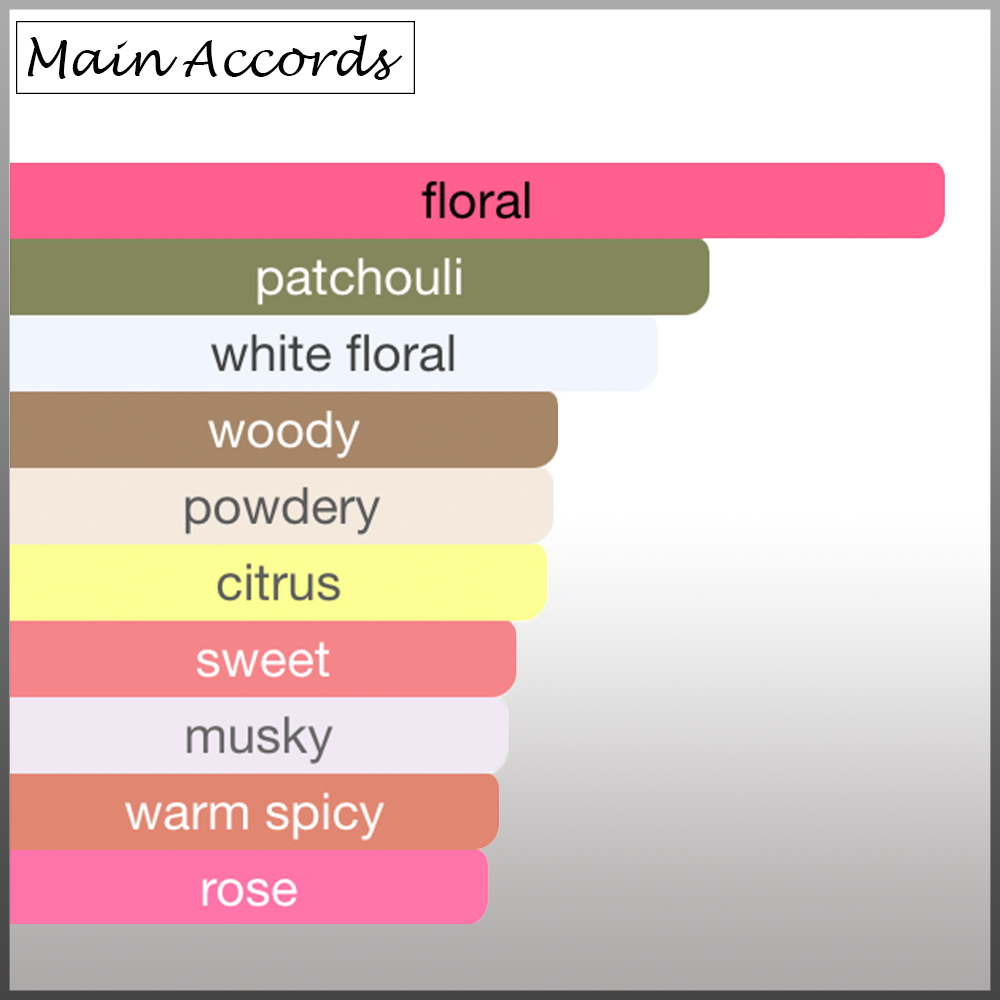 Tea, Bergamot, Orchid, Jasmine, Rose, Freesia, African Orange Flower, Patchouli, Musk and Vanilla.